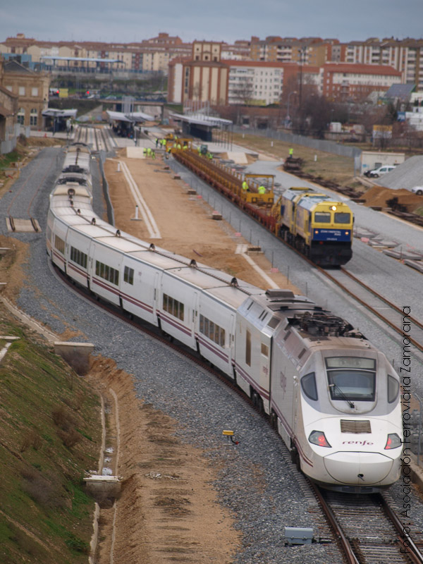 Esta ultima semana ha sido la que ha marcado la llegada del carril por el que circularán los trenes de Alta Velocidad por Zamora. Tras la colocación de traviesas y la placa que va en la zona de la estación, han llegado los primero trenes "Carrileros" traccionados por las locomotoras 319 de Continental Rail. Tras montar la primera via, mediante un sistema de Orugas que tiraba de los carriles posicionandolos sobre su ubicación, la segunda via ha sido descargada directamente sobre sus traviesas a través de unas rampas que salian del propio comboi.