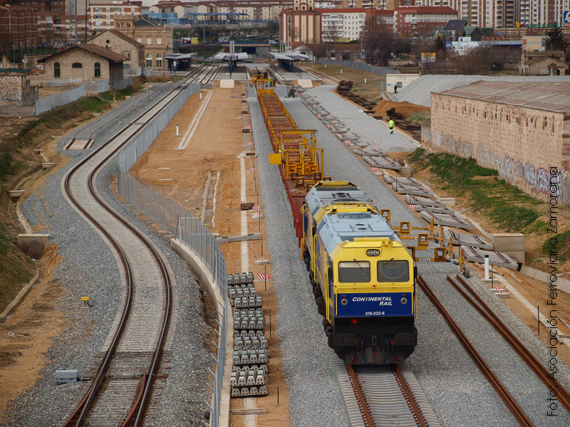 Esta ultima semana ha sido la que ha marcado la llegada del carril por el que circularán los trenes de Alta Velocidad por Zamora. Tras la colocación de traviesas y la placa que va en la zona de la estación, han llegado los primero trenes "Carrileros" traccionados por las locomotoras 319 de Continental Rail. Tras montar la primera via, mediante un sistema de Orugas que tiraba de los carriles posicionandolos sobre su ubicación, la segunda via ha sido descargada directamente sobre sus traviesas a través de unas rampas que salian del propio comboi.