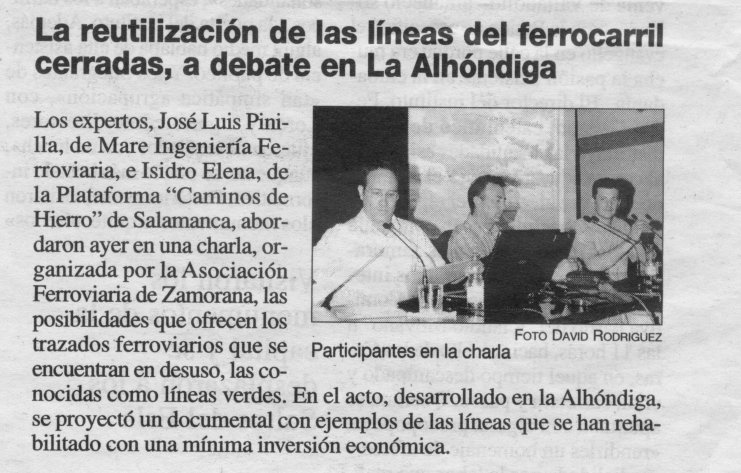 - Conferencia. "Puesta en valor de las Líneas de Ferrocarril cerradas" A cargo de D. José Luis Pinilla (MARE Ingeniería Ferroviaria) y D. Isidro Elena (Plataforma "Caminos de Hierro" de Salamanca)