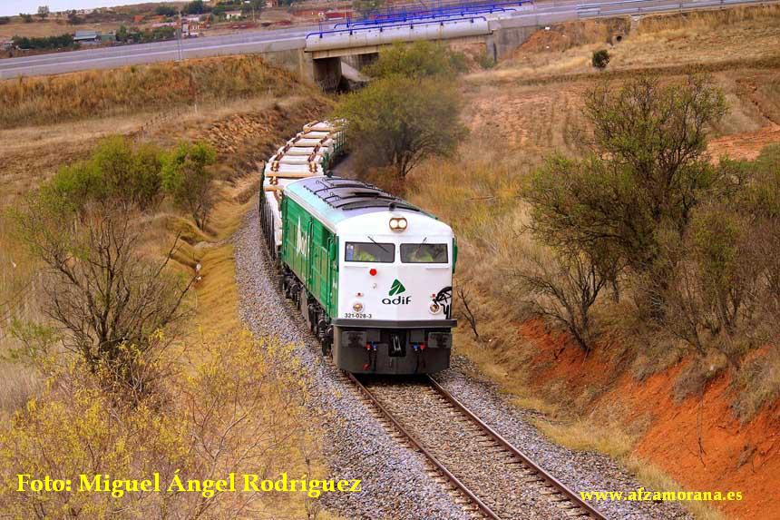 La 321-028 remolcando un tren de traviesas con destino Sarracín de Aliste.