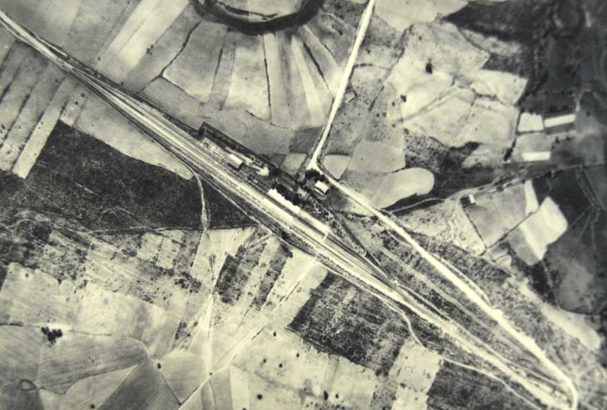 Fotografía aérea de la Estación de Losacio en el año 1933. Captada en el programa del Vuelo Americano, esta imagen muestra la estación terminada y sin vías. Cuarta Jefatura de Estudios y Construcción de Ferrocarriles. A. H. P. |