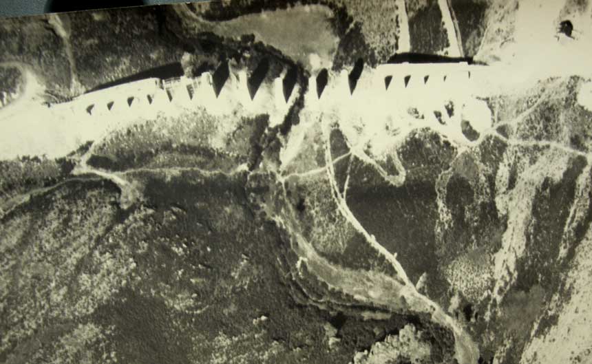 Fotografía aérea del viaducto de Truchas en el año 1933. Captada en el programa del Vuelo Americano, esta imagen muestra el viaducto en plena construcción. Cuarta Jefatura de Estudios y Construcción de Ferrocarriles. A. H. P. |