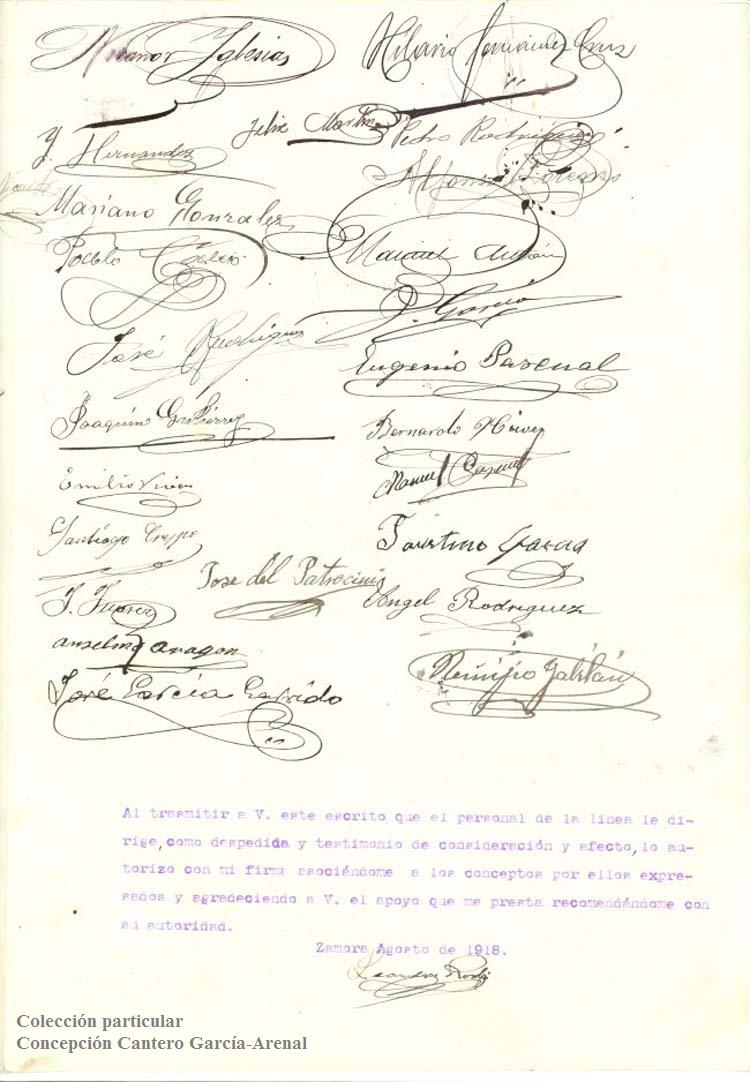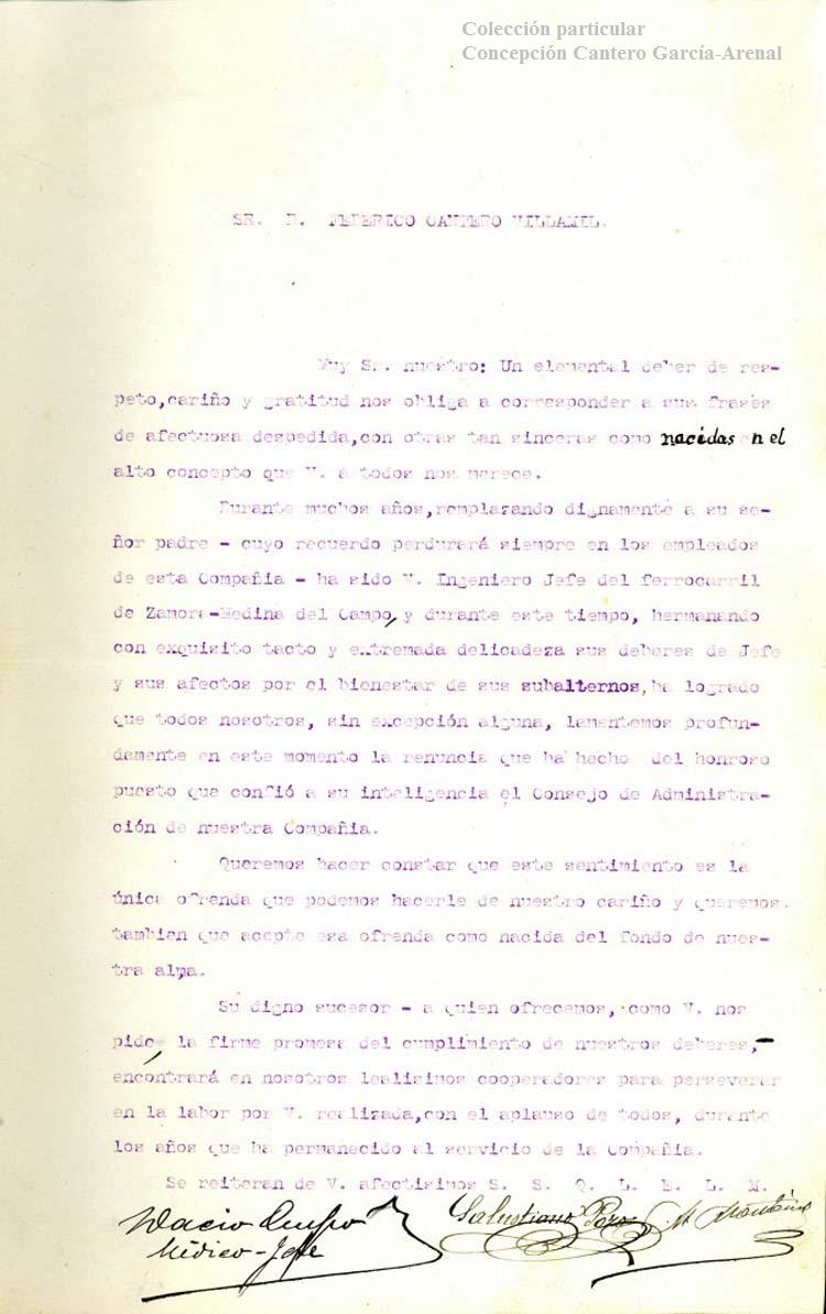 Carta de los empleados del Ferrocarril Medina del Campo - Zamora, lamentando la renuncia a la dirección de la Línea, del Ingeniero Federico Cantero Villamil. (Zamora, Agosto de 1918) |